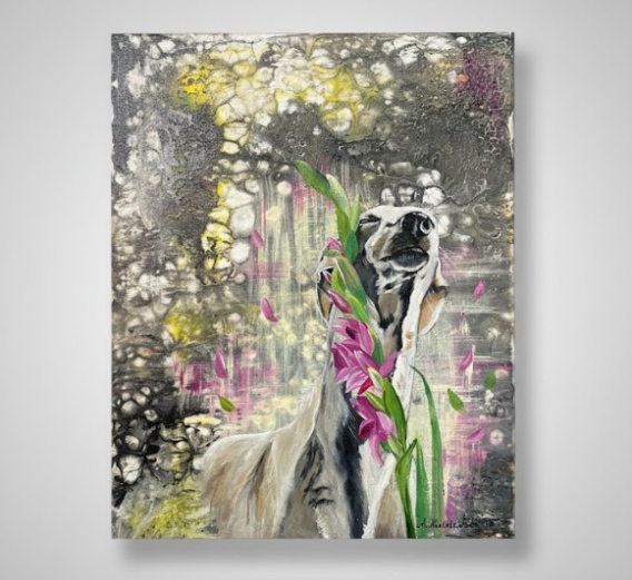 Obraz Ręcznie Malowany "Kwiatowa Błogość" – Chart w Mieczykach 40x50 cm
