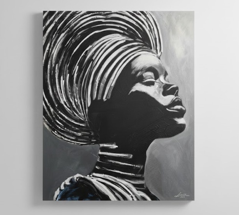 Obraz "Etniczna Duma" to wyrafinowane studium kontrastu, zamknięte w formacie 75x100 cm. Dzieło przedstawia stylizowany profil kobiety o posągowej urodzie, której głowę zdobi imponujący, geometrycznie ułożony turban, a szyję – tradycyjne obręcze. Całość utrzymana jest w szlachetnej, monochromatycznej kolorystyce: głęboka czerń miesza się tu z bielą i licznymi odcieniami szarości.